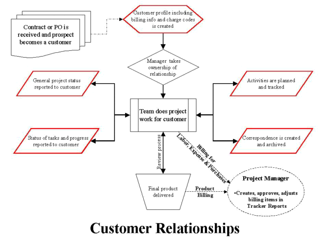 The process of managing customer relationships follows the workflow outlined below. Select the red areas for screen shots of these key process points.