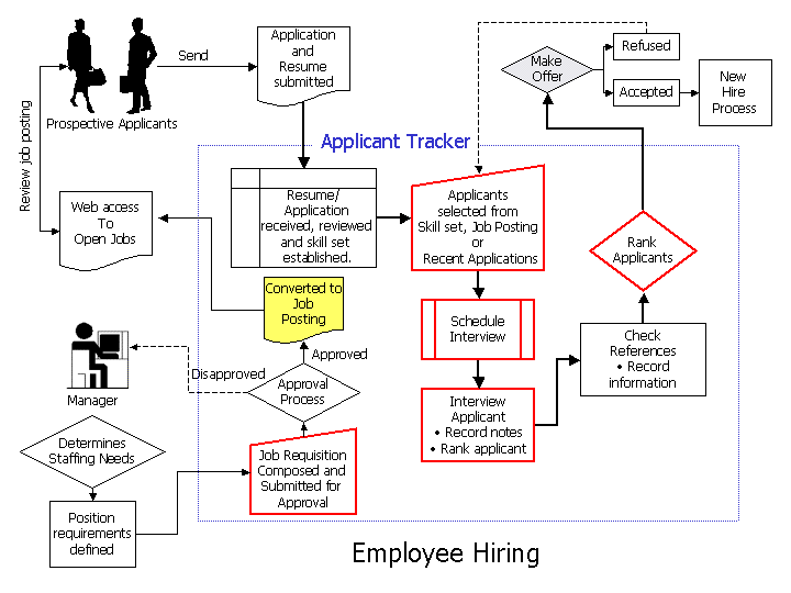 Employee hiring processes follow the workflow outlined below. Select the red areas for screen shots of these key process points.